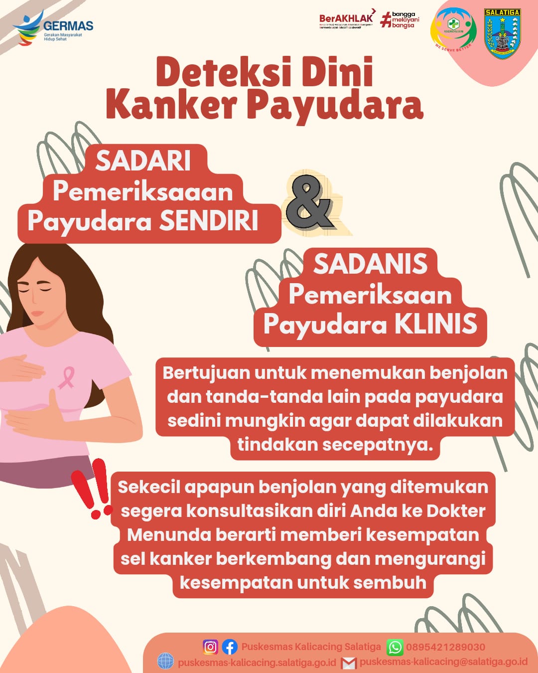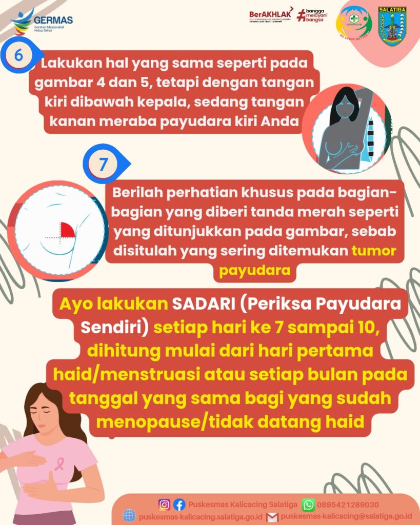 setiap hari ke 7 sampai 10, dihitung mulai dari hari pertama haid/ menstruasi atau setiap bulan pada tanggal yang sama bagi yang sudah menopause/ tidak datang haid. Lakukan SADANIS (Periksa Payudara Klinis) di Puskesmas terdekat. #CERDIK #CegahPTM #DukungGERMAS #HariKartini #KankerPayudara #SADARI #SADANIS #BreastCancer