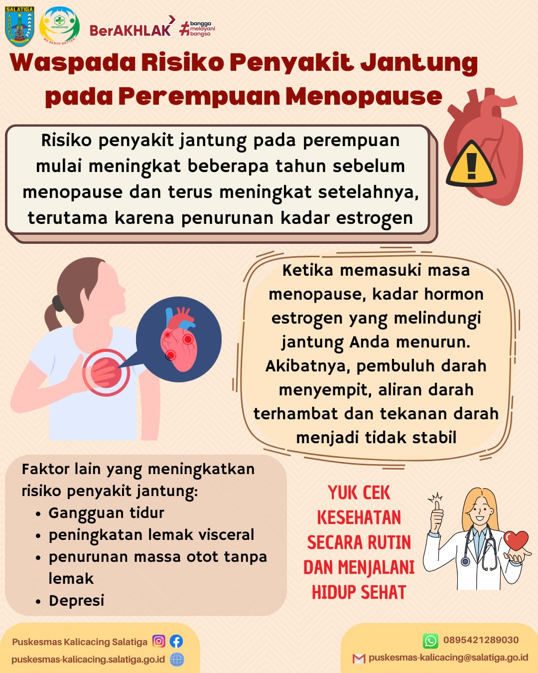 Risiko penyakit jantung terhadap perempuan memang meningkat seiring memasuki masa menopause. Hati-hati ya, untuk anak diluar sana ingatkan ibunya agar menjaga kesehatan dengan menerapkan hidup sehat. Menjaga pola makan dan rajin-rajin berolahraga untuk terus menjaga kesehatan jantung. Rutin cek kesehatan setiap bulan bisa membantu ibu-ibu mengatasi masalah tersebut #JanjiHidupSehat #AyoSehat #HindariRisikoPenyakitJantung