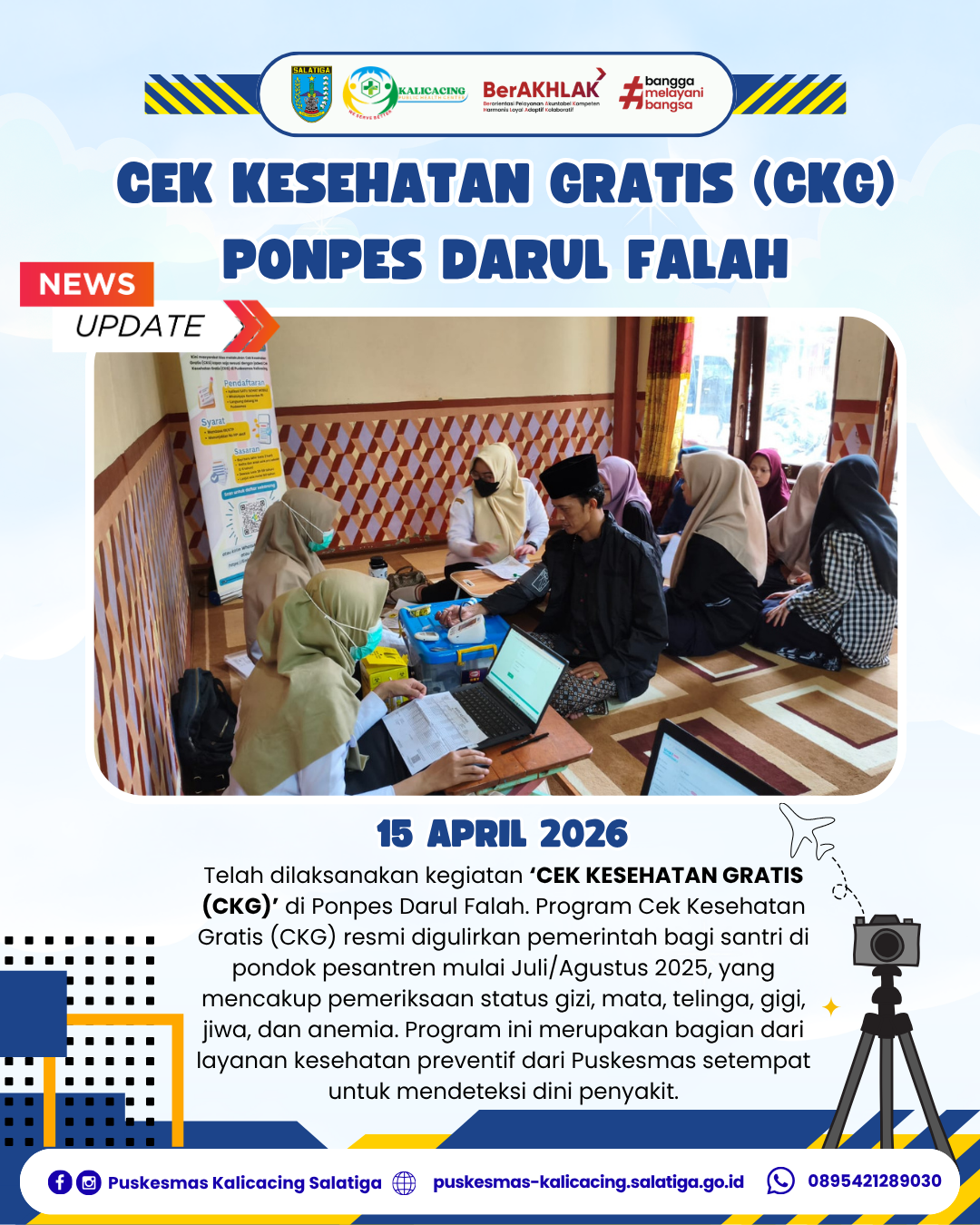 Telah dilaksanakan kegiatan ‘CEK KESEHATAN GRATIS (CKG)’ di Ponpes Darul Falah. Program Cek Kesehatan Gratis (CKG) resmi digulirkan pemerintah bagi santri di pondok pesantren mulai Juli/Agustus 2025, yang mencakup pemeriksaan status gizi, mata, telinga, gigi, jiwa, dan anemia. Program ini merupakan bagian dari layanan kesehatan preventif dari Puskesmas setempat untuk mendeteksi dini penyakit.