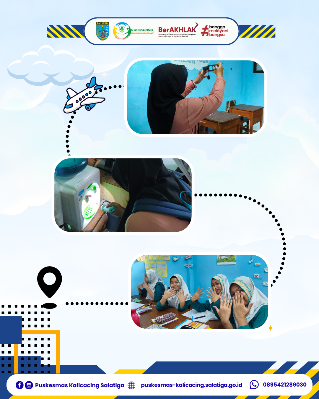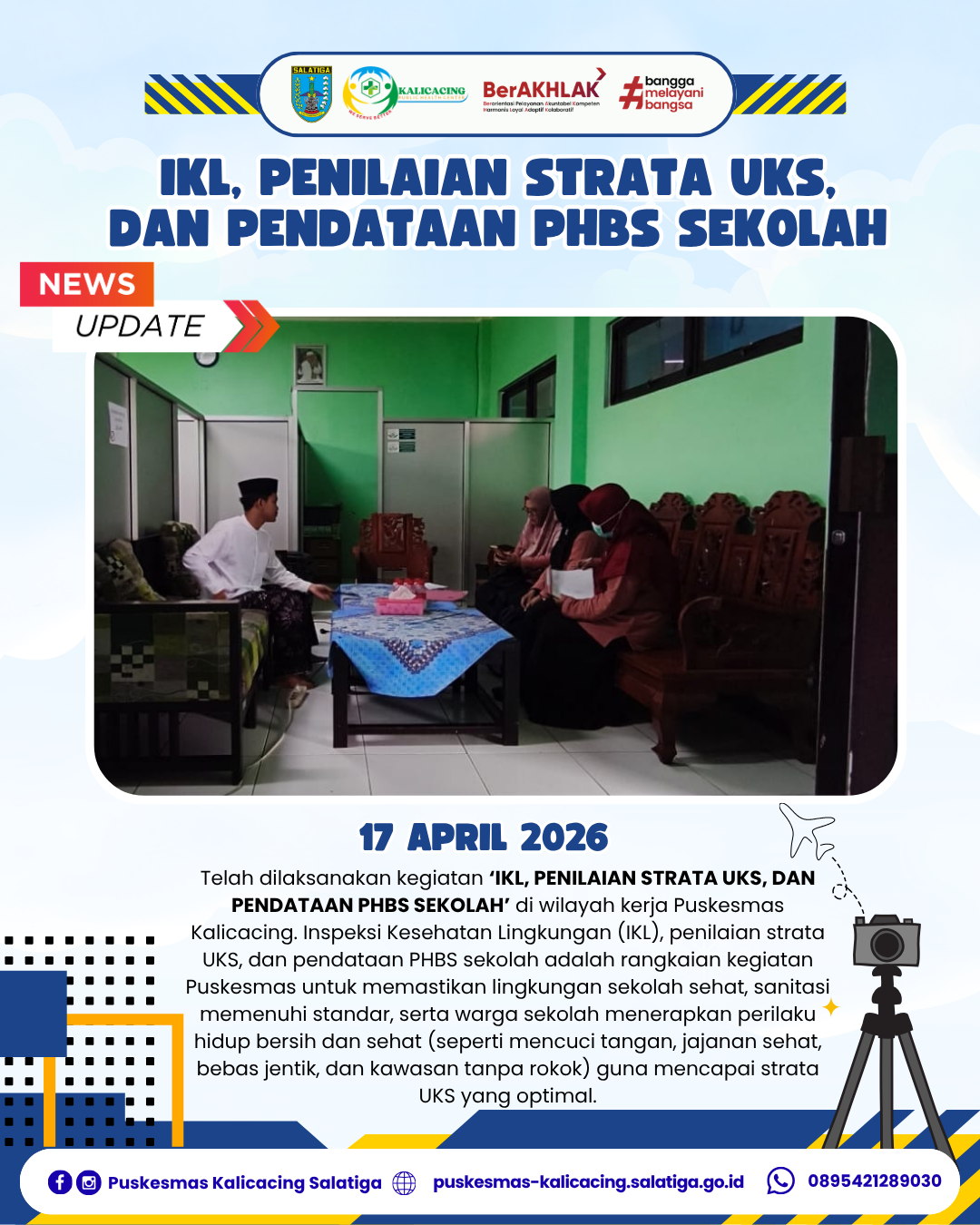 Telah dilaksanakan kegiatan ‘IKL, PENILAIAN STRATA UKS, DAN PENDATAAN PHBS SEKOLAH’ di wilayah kerja Puskesmas Kalicacing. Inspeksi Kesehatan Lingkungan (IKL), penilaian strata UKS, dan pendataan PHBS sekolah adalah rangkaian kegiatan Puskesmas untuk memastikan lingkungan sekolah sehat, sanitasi memenuhi standar, serta warga sekolah menerapkan perilaku hidup bersih dan sehat (seperti mencuci tangan, jajanan sehat, bebas jentik, dan kawasan tanpa rokok) guna mencapai strata UKS yang optimal.