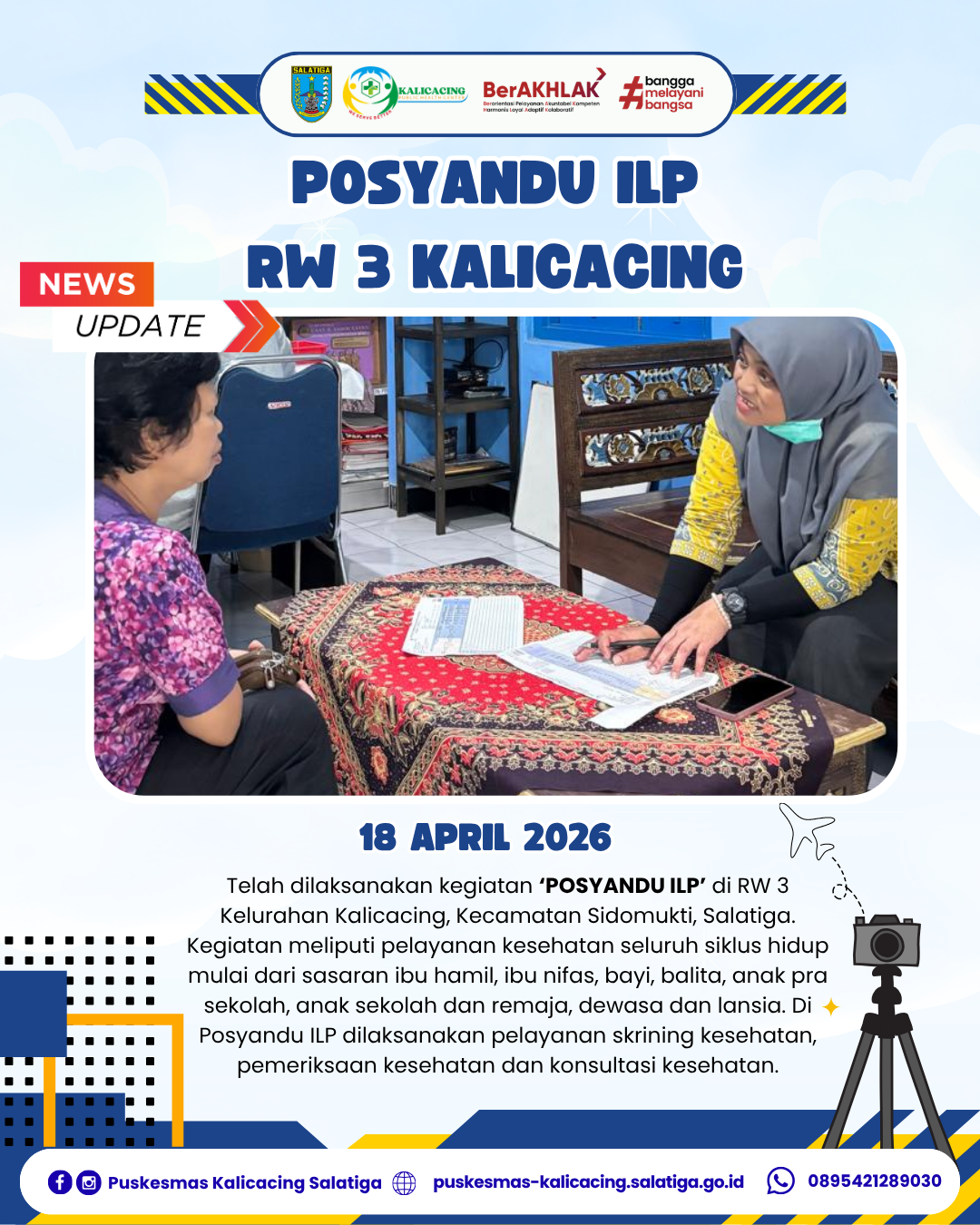 Telah dilaksanakan kegiatan ‘POSYANDU ILP’ di RW 3 Kelurahan Kalicacing, Kecamatan Sidomukti, Salatiga. Kegiatan meliputi pelayanan kesehatan seluruh siklus hidup mulai dari sasaran ibu hamil, ibu nifas, bayi, balita, anak pra sekolah, anak sekolah dan remaja, dewasa dan lansia. Di Posyandu ILP dilaksanakan pelayanan skrining kesehatan, pemeriksaan kesehatan dan konsultasi kesehatan.