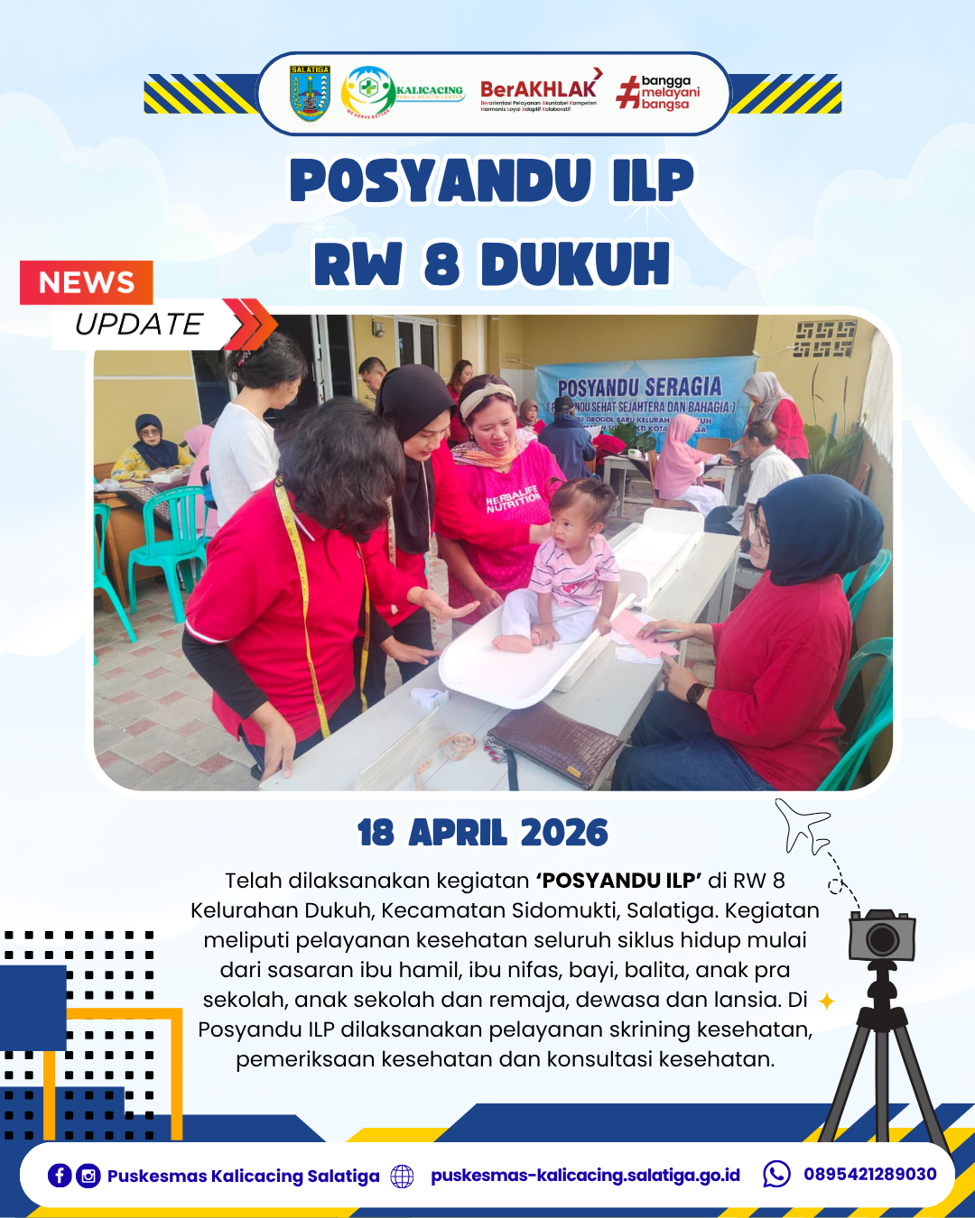 Telah dilaksanakan kegiatan ‘POSYANDU ILP’ di RW 8 Kelurahan Dukuh, Kecamatan Sidomukti, Salatiga. Kegiatan meliputi pelayanan kesehatan seluruh siklus hidup mulai dari sasaran ibu hamil, ibu nifas, bayi, balita, anak pra sekolah, anak sekolah dan remaja, dewasa dan lansia. Di Posyandu ILP dilaksanakan pelayanan skrining kesehatan, pemeriksaan kesehatan dan konsultasi kesehatan.