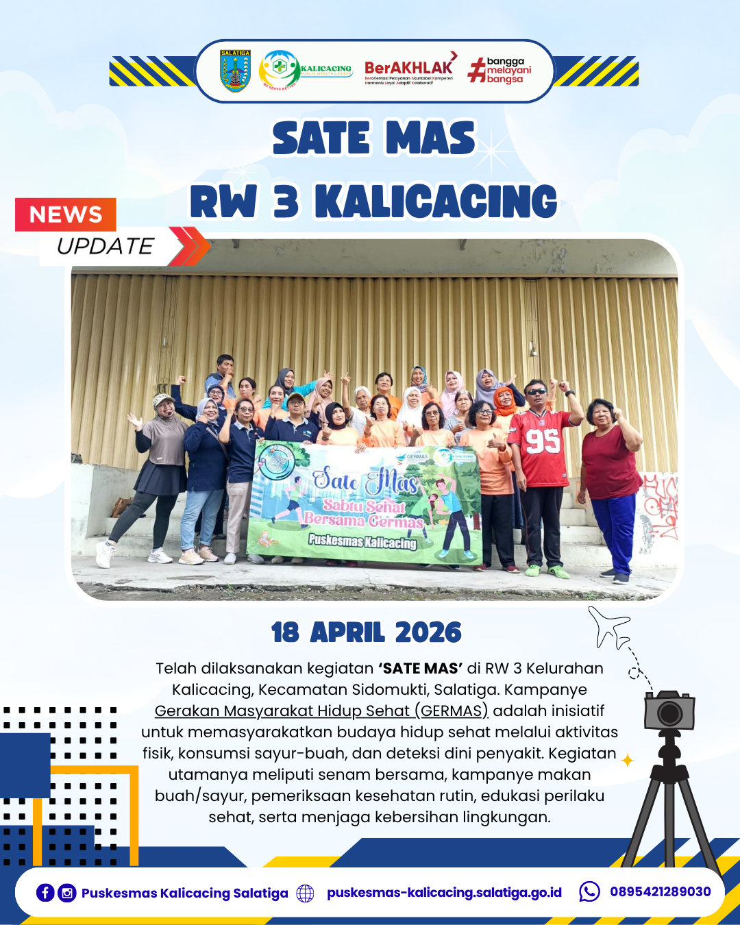 Telah dilaksanakan kegiatan ‘SATE MAS’ di RW 3 Kelurahan Kalicacing, Kecamatan Sidomukti, Salatiga. Kampanye Gerakan Masyarakat Hidup Sehat (GERMAS) adalah inisiatif untuk memasyarakatkan budaya hidup sehat melalui aktivitas fisik, konsumsi sayur-buah, dan deteksi dini penyakit. Kegiatan utamanya meliputi senam bersama, kampanye makan buah/sayur, pemeriksaan kesehatan rutin, edukasi perilaku sehat, serta menjaga kebersihan lingkungan.
