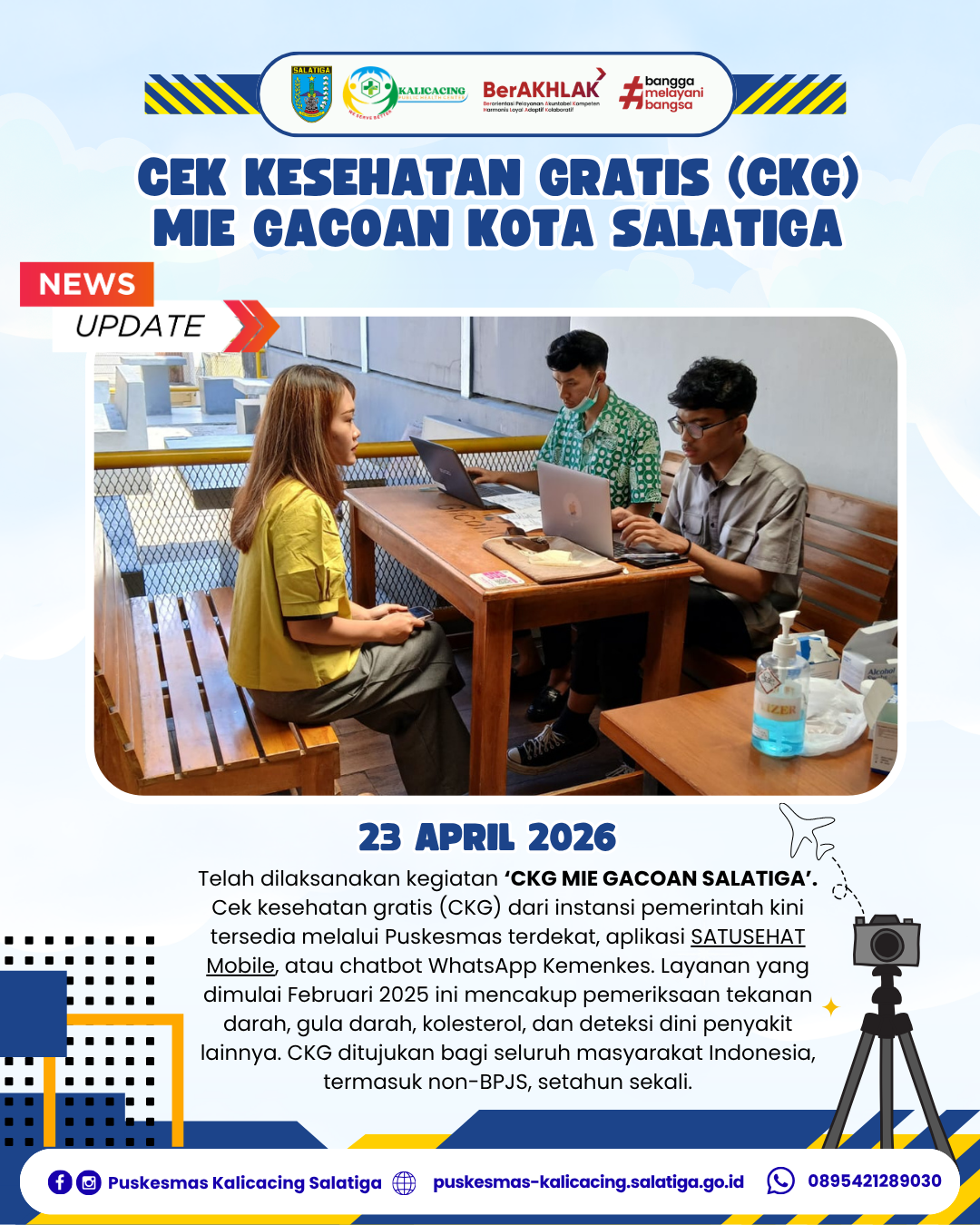 Telah dilaksanakan kegiatan ‘CKG MIE GACOAN SALATIGA’. Cek kesehatan gratis (CKG) dari instansi pemerintah kini tersedia melalui Puskesmas terdekat, aplikasi SATUSEHAT Mobile, atau chatbot WhatsApp Kemenkes. Layanan yang dimulai Februari 2025 ini mencakup pemeriksaan tekanan darah, gula darah, kolesterol, dan deteksi dini penyakit lainnya. CKG ditujukan bagi seluruh masyarakat Indonesia, termasuk non-BPJS, setahun sekali.