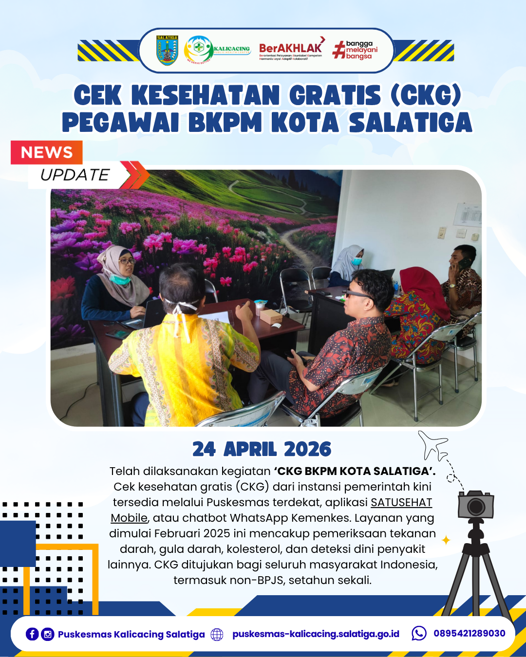 Telah dilaksanakan kegiatan ‘CKG BKPM KOTA SALATIGA’. Cek kesehatan gratis (CKG) dari instansi pemerintah kini tersedia melalui Puskesmas terdekat, aplikasi SATUSEHAT Mobile, atau chatbot WhatsApp Kemenkes. Layanan yang dimulai Februari 2025 ini mencakup pemeriksaan tekanan darah, gula darah, kolesterol, dan deteksi dini penyakit lainnya. CKG ditujukan bagi seluruh masyarakat Indonesia, termasuk non-BPJS, setahun sekali.