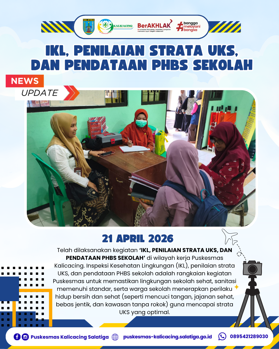 Telah dilaksanakan kegiatan ‘IKL, PENILAIAN STRATA UKS, DAN PENDATAAN PHBS SEKOLAH’ di wilayah kerja Puskesmas Kalicacing. Inspeksi Kesehatan Lingkungan (IKL), penilaian strata UKS, dan pendataan PHBS sekolah adalah rangkaian kegiatan Puskesmas untuk memastikan lingkungan sekolah sehat, sanitasi memenuhi standar, serta warga sekolah menerapkan perilaku hidup bersih dan sehat (seperti mencuci tangan, jajanan sehat, bebas jentik, dan kawasan tanpa rokok) guna mencapai strata UKS yang optimal.