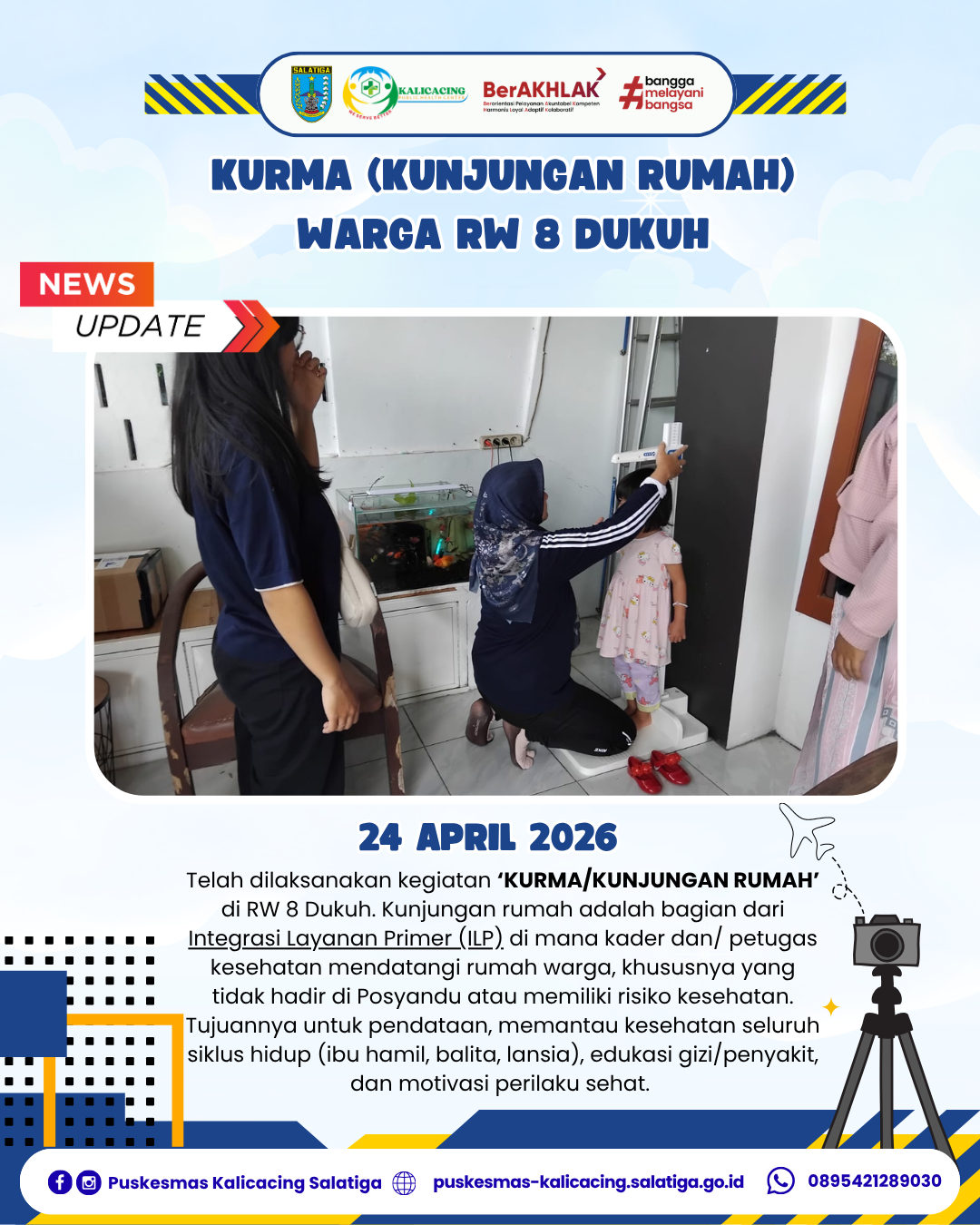 Telah dilaksanakan kegiatan ‘KURMA/KUNJUNGAN RUMAH’ di RW 8 Dukuh. Kunjungan rumah adalah bagian dari Integrasi Layanan Primer (ILP) di mana kader dan/ petugas kesehatan mendatangi rumah warga, khususnya yang tidak hadir di Posyandu atau memiliki risiko kesehatan. Tujuannya untuk pendataan, memantau kesehatan seluruh siklus hidup (ibu hamil, balita, lansia), edukasi gizi/penyakit, dan motivasi perilaku sehat.